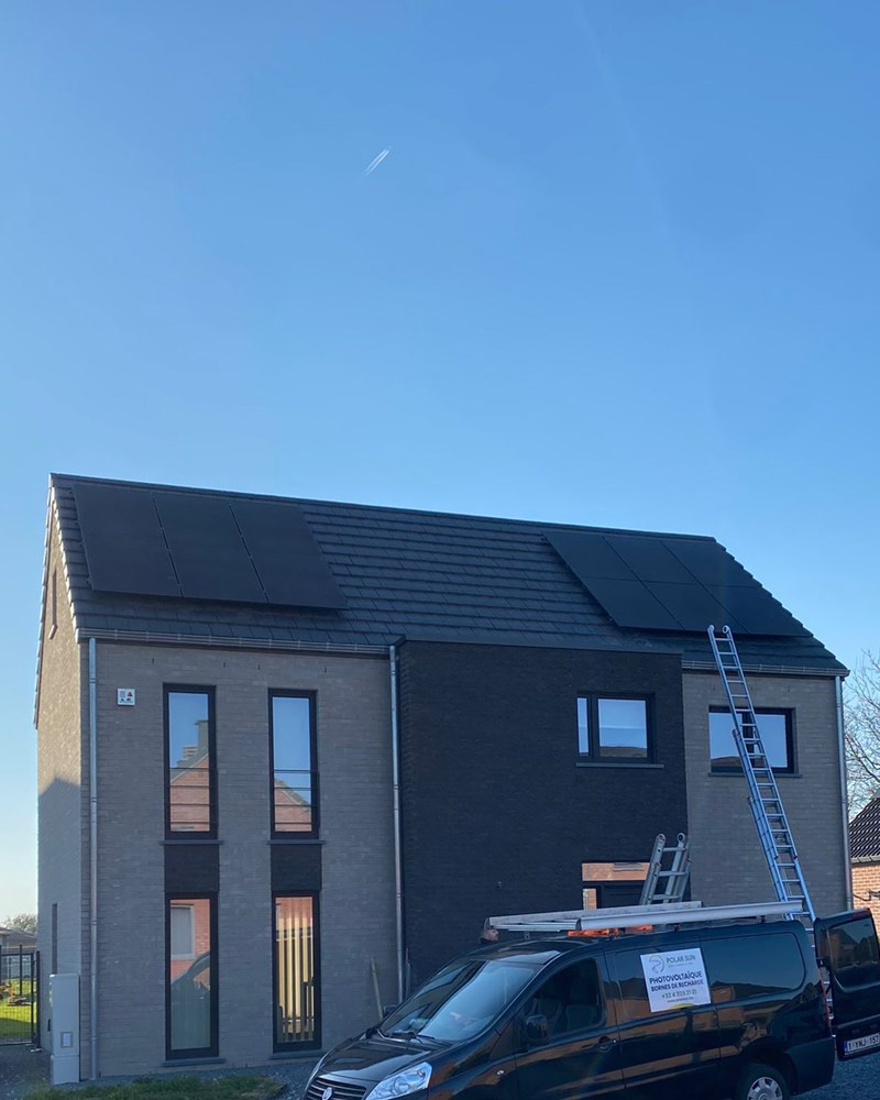 Cette maison a accueilli 12 panneaux solaires Trina Solar 410 Full Black. L'électricité des panneaux photovoltaïques est convertie en courant alternatif par des onduleurs SolarEdge. La puissance installée est de 4.920 Wc et sert à couvrir la consommation du ménage.