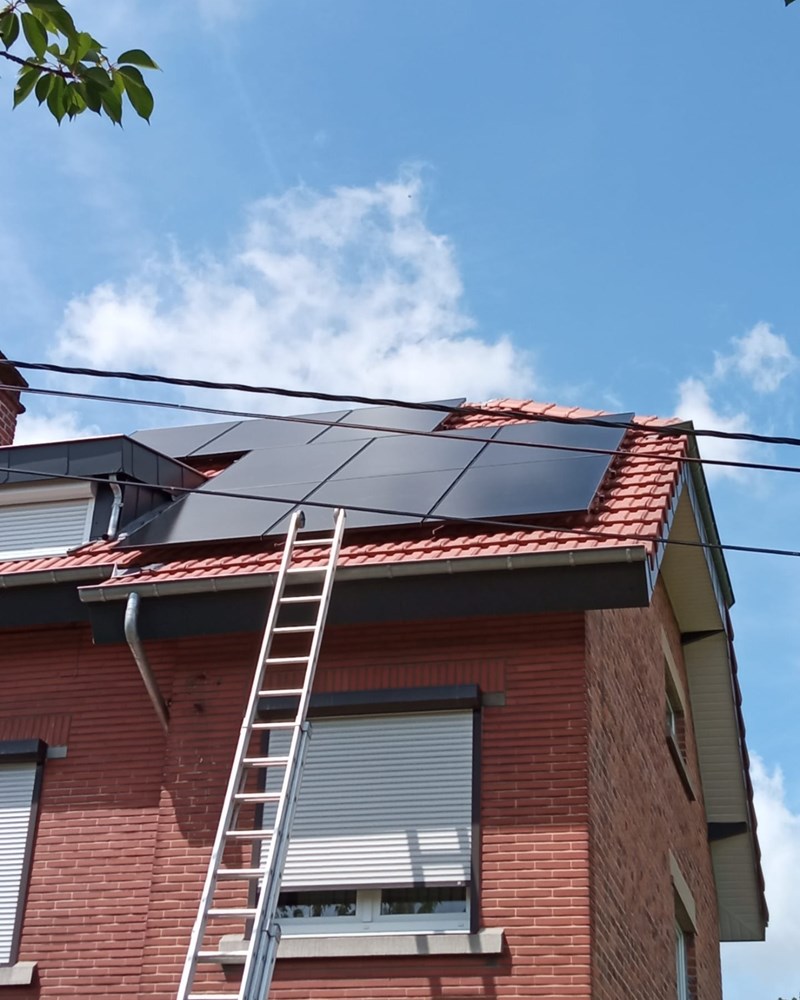 Cette maison a accueilli 14 panneaux solaires Hyundai 400w Ultra Full Black Shingled. L'électricité des panneaux photovoltaïques est convertie en courant alternatif par des onduleurs SMA. La puissance installée est de 5.600 Wc et sert à couvrir la consommation du ménage.