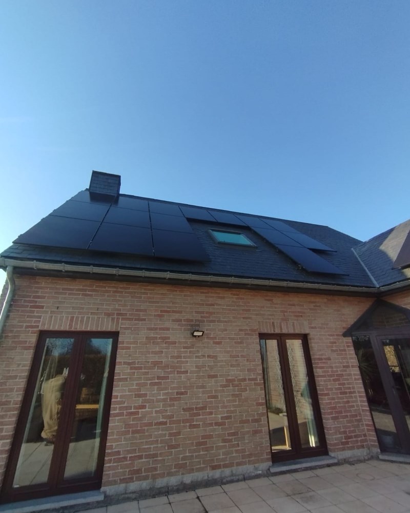 Cette maison a accueilli 20 panneaux solaires Trina Solar 410 Full Black. L'électricité des panneaux photovoltaïques est convertie en courant alternatif par des onduleurs SolarEdge. La puissance installée est de 8200 Wc et sert à couvrir la consommation du ménage.
