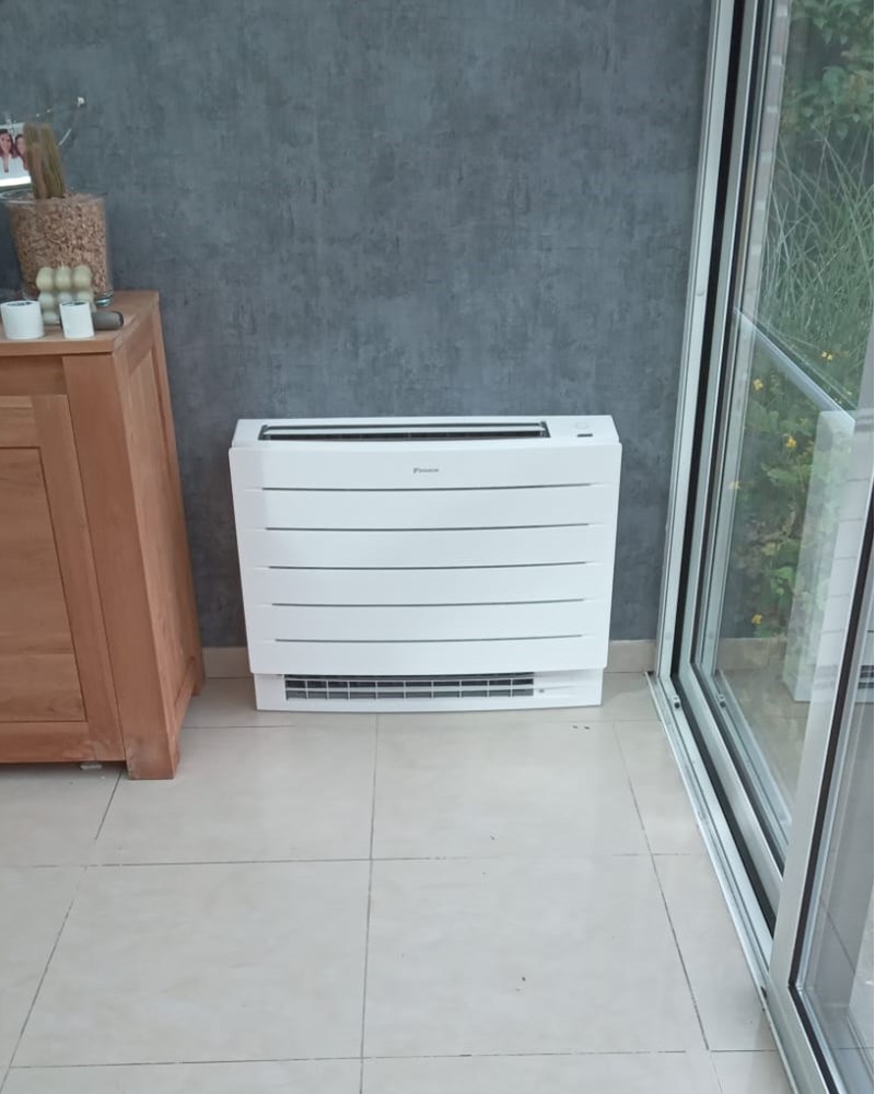 Installatie van drie binnenunits (twee Comfora wandunits en één console) en één buitenunit van Daikin in een woning gelegen in 4530 Vaux en Borset.