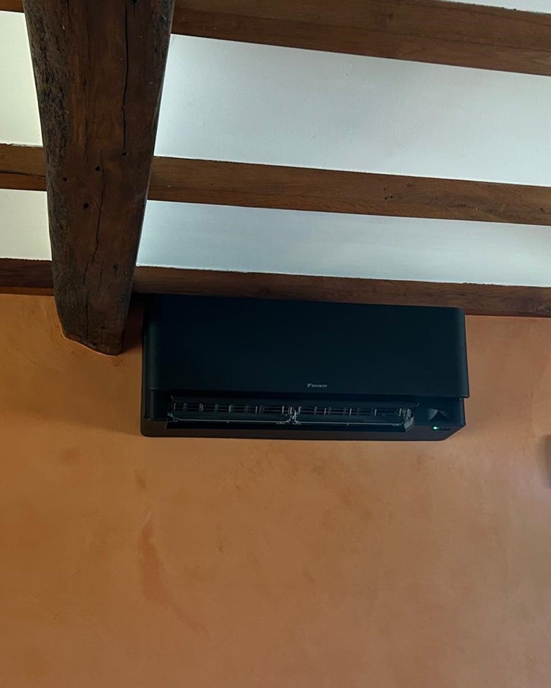 De binnenunit, model FTXA35CB uit de Stylish-reeks, werd in de woonkamer geïnstalleerd. Deze zwarte (Blackwood) wandunit combineert esthetiek en prestaties voor maximaal comfort in elk seizoen.